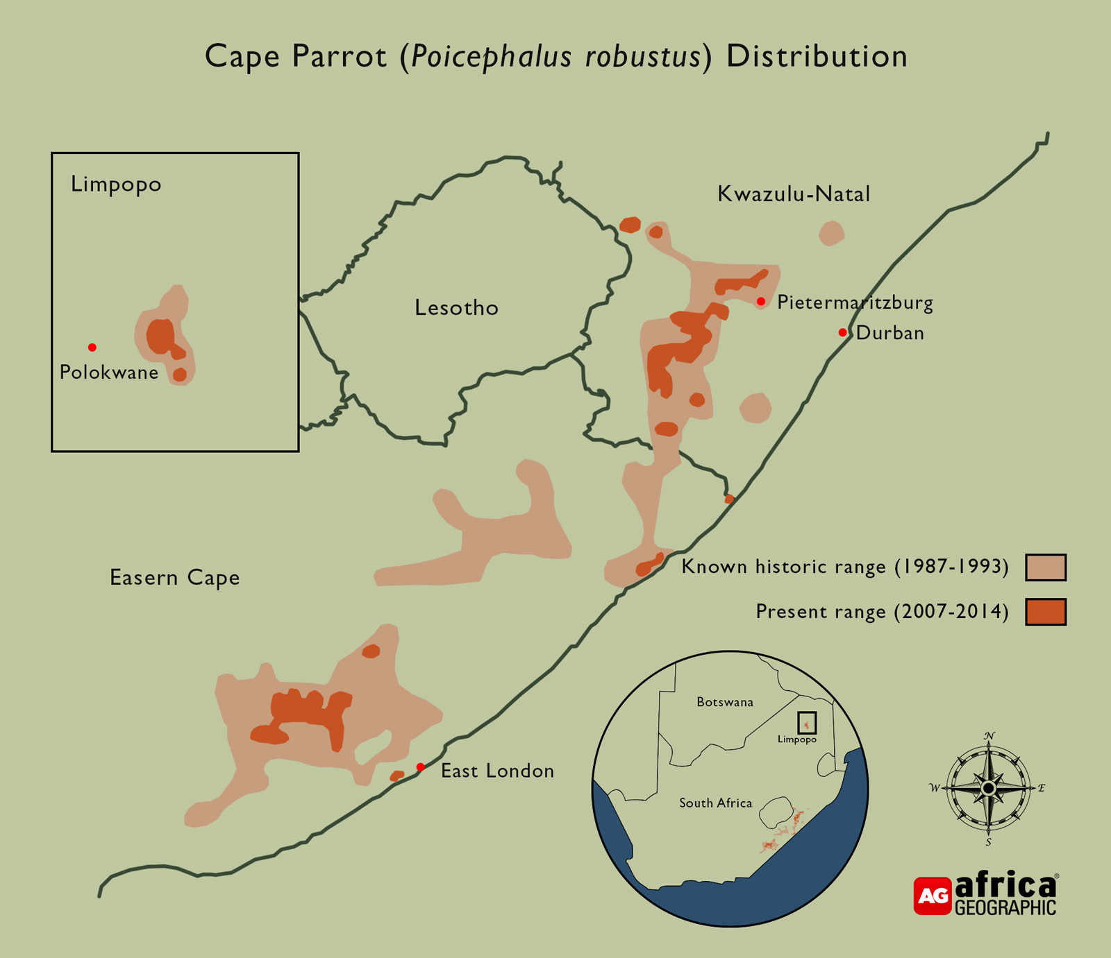 The specialist dietary and breeding requirements of the Cape parrots means that their range is restricted to the mosaic of remaining Mistbelt forests in Eastern Cape and KwaZulu Natal, with a small population in the forests of Magoebaskloof in Limpopo. Research has shown that there are three genetically distinct subpopulations: one in the Amatole mountains in the Eastern Cape, another which ranges from Engcobo and Mthatha in the Eastern Cape to the midlands of KwaZulu Natal and the isolated population in Magoebaskloof.