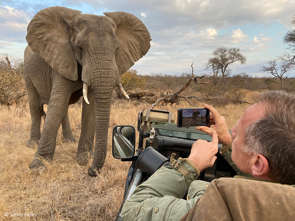 Earlier, we were trundling along a dusty winter morning bush track in an old Landy when we spotted a herd of frisky bulls jostling a hundred meters away. We switched off and watched the spectacle. One of the ellies broke off and headed our way, the others moving off to our right, still messing about. Our bull approached in that jaunty way they have, the shuffle-run that covers ground quickly, his head bobbing and trunk swinging. Yet his last few meters were all about cautious curiosity before he settled down next to us. His bright, observant eyes took us all in, scanning our vehicle and watching our every move. After several minutes of safari nirvana, he gave us a wonderful ear-clap and we respected the message by heading off.