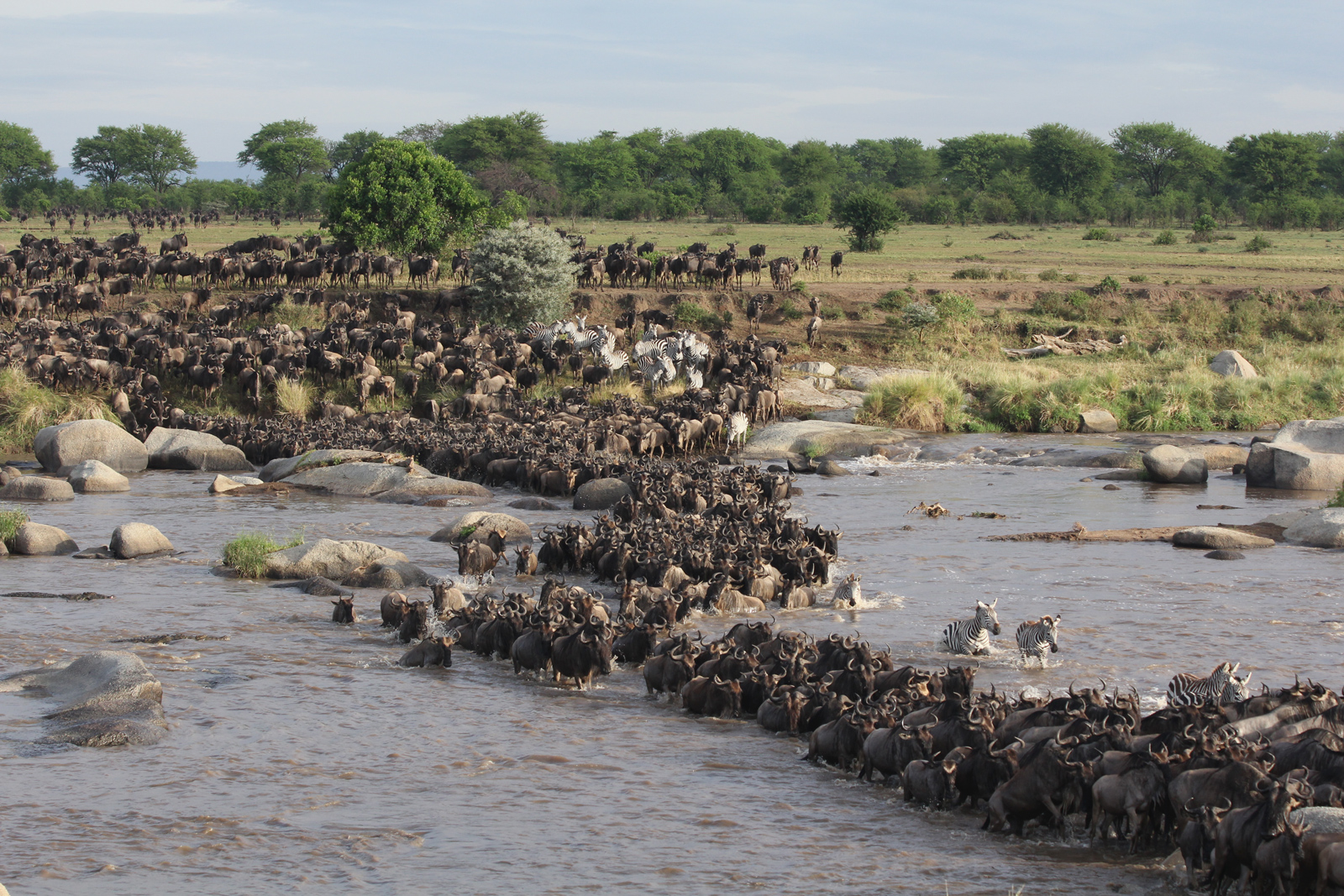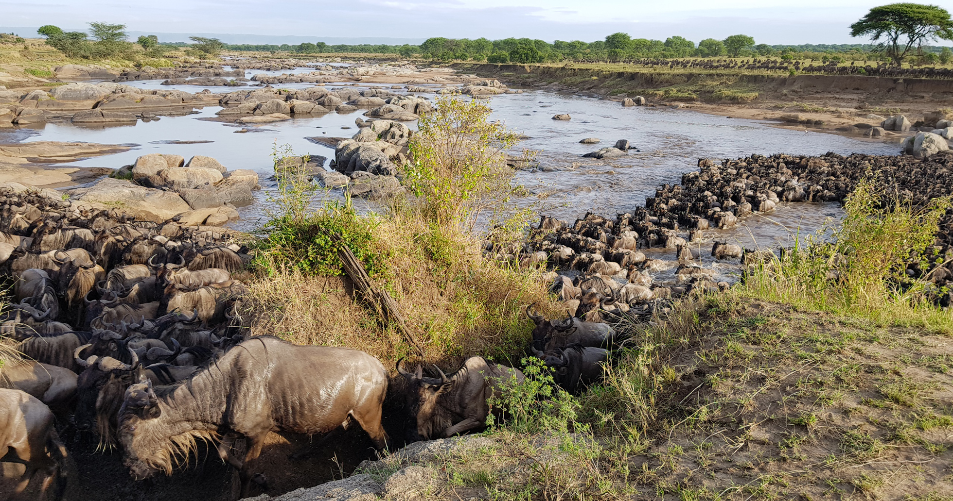 The Great Wildebeest Migration is a never-ending pursuit of nutritious grazing by the two million-strong wildebeest and zebra herds of the Mara-Serengeti ecosystem. In the northern-most months of this roughly circular annual journey, the herds have to cross firstly the Grumeti River and then the Mara River en-route north and again on the return journey south. Often various herds wander back and forth across the rivers, as they seek out the best grazing.