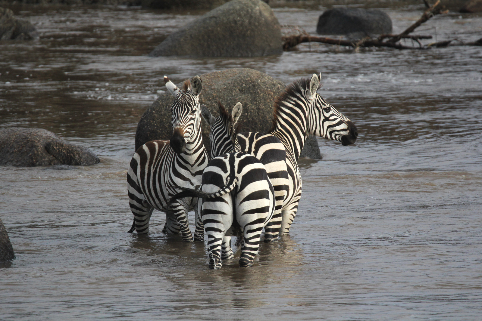 Zebras seemed slightly more organised, more alert to danger, pickier about when and where to cross. One group chose to cross a few metres upstream from the tightly-packed thrashing wildebeest horde, creating a bow wave to push along a tiny foal with wide eyes. The tiny rocking horse scrambled and surfed to shore, shook himself off a few metres from us and staggered off to follow his herd.