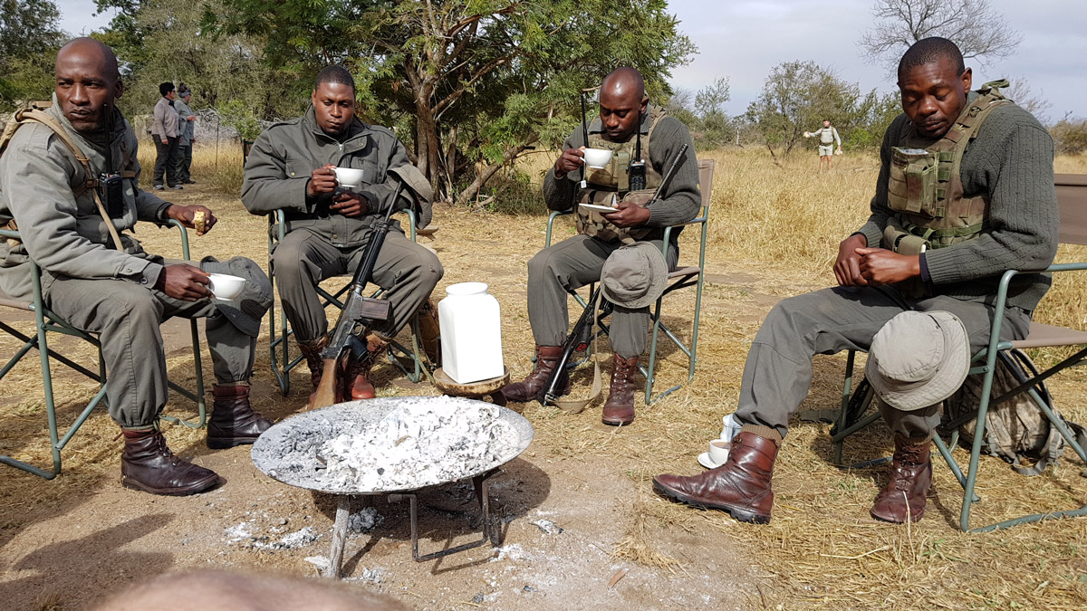 Remarkably realistic, to be sure. I was in on the act – only our guests were not aware that this was a setup. Back in camp, it was terrific to chat over a cup of coffee with the anti-poaching guys – to get a feel for their working day. Such dedicated, remarkable people they are. All brave smiles and evident passion. The team leader was called away early, to attend to an actual encounter on the go some distance away.