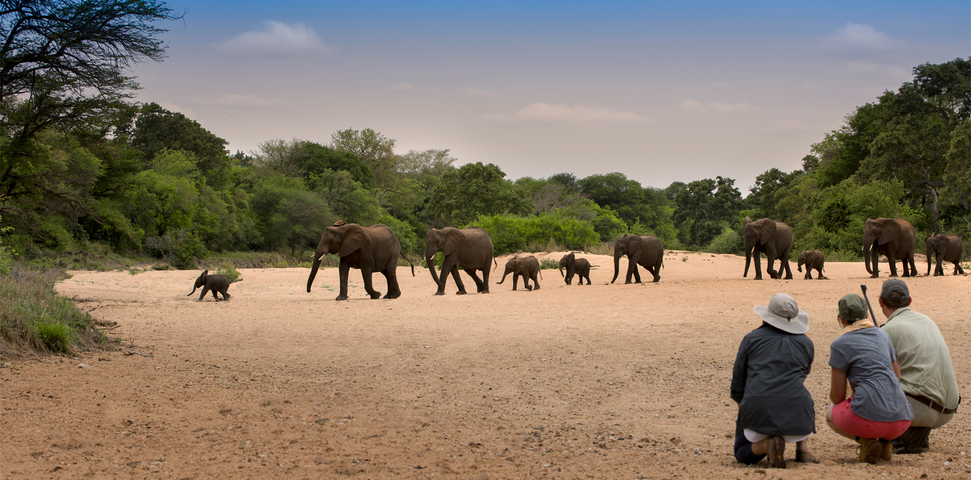 A large breeding herd of elephants appeared behind us; as if by magic, as they do. They were moving fast – and we were in their direct path. Tails up and ears flared, trumpeting, tiny babies scrambling to keep up with the herd – something had spooked them. We ducked behind a small copse of gwarrie, there being nothing more substantial in the area, to watch and assess. No need yet to make our presence known and hopefully steer the herd in another direction.