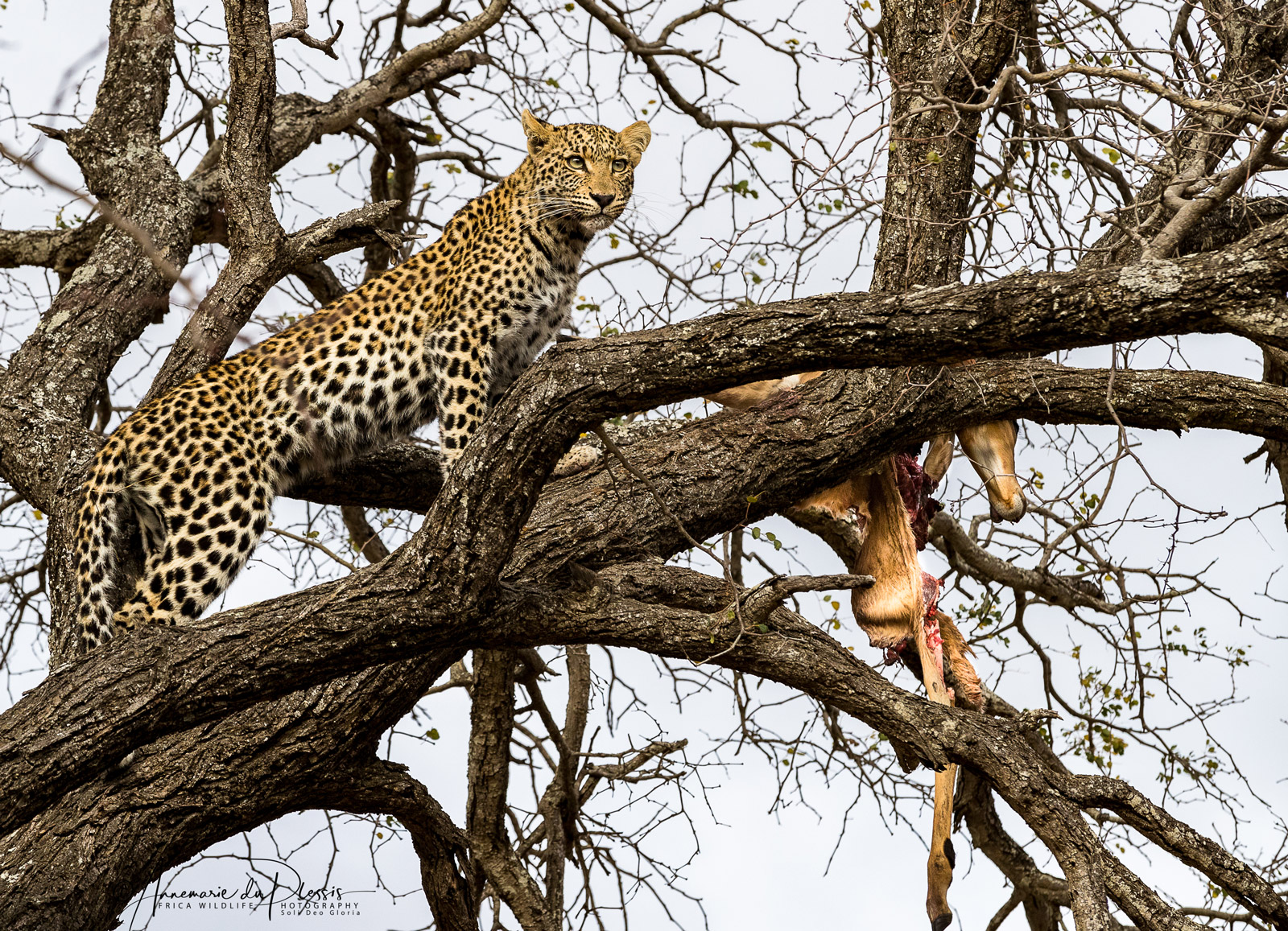 On another morning, and after some astute tracking and reading of the signs, Ginger and Anthony found a mother leopard with her two adolescent cubs. She had stashed a freshly-killed impala in a knobthorn, and the three of them were taking turns up the tree.