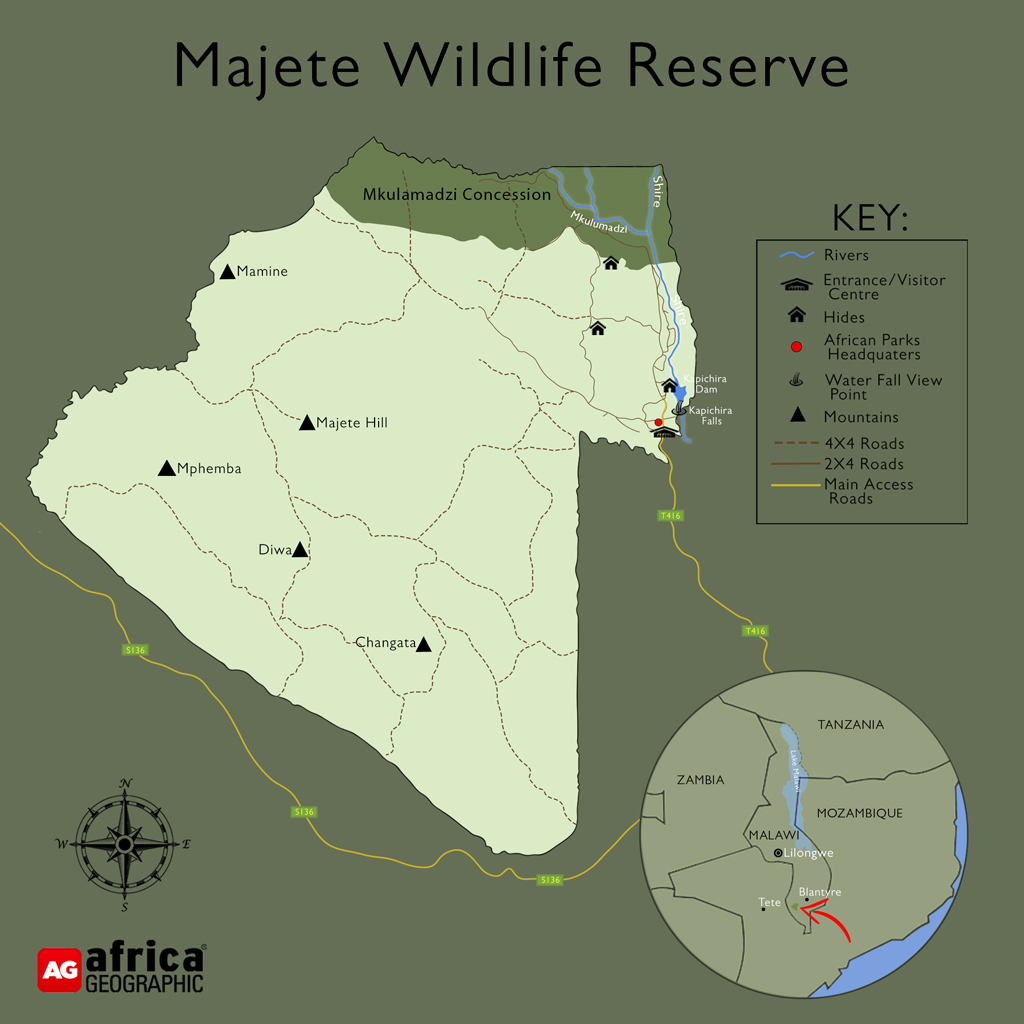 In the Lower Shire River valley in Malawi’s southwestern corner, Majete Wildlife Reserve encompasses 700km2 (70,000 hectares) of towering granite hills, grassy plains, and miombo woodlands. Bulbous star chestnuts have forced their way up through the rocky kopjes, and hulking baobabs dot the savanna, while the riparian forests of the river valley are lush with ilala palms and ancient mahoganies.