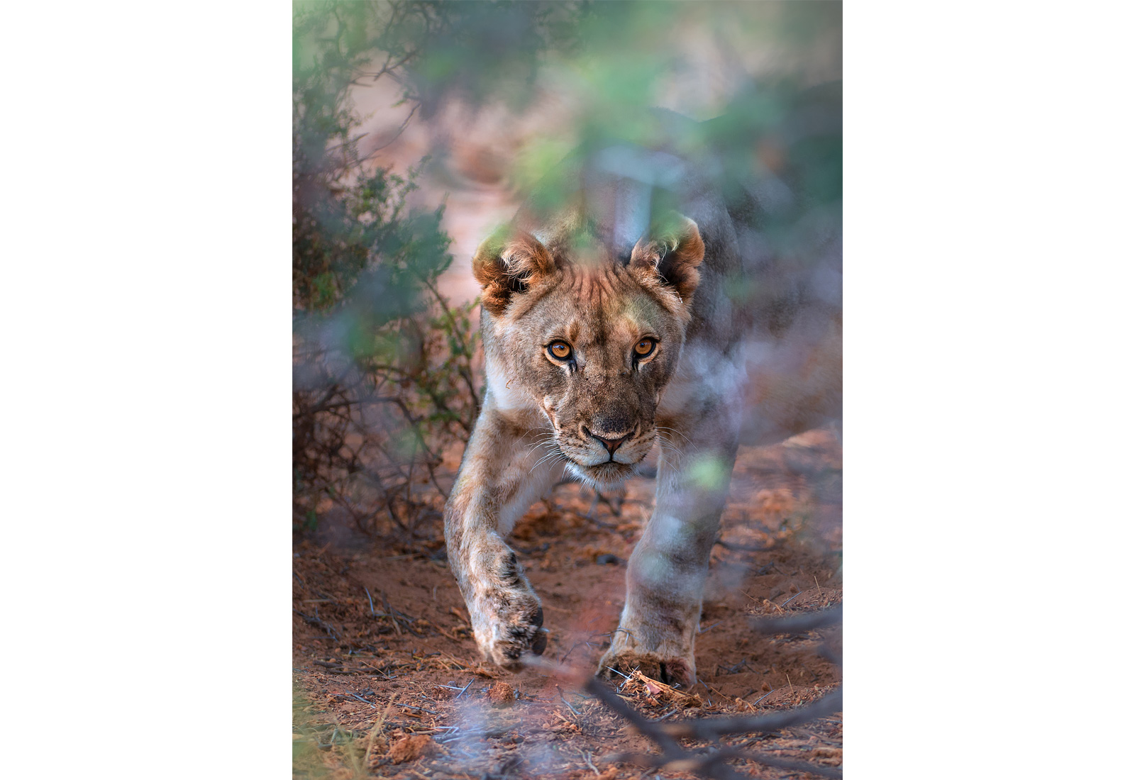 A young female named Angela, about two-and-a-half years old, is part of the Huab River Valley pride. The pride consists of Angela, her sister, XPL 76 and the young female’s two younger brothers. Here, she stalks an oryx from her vantage point during sunset. © Ingrid Mandt