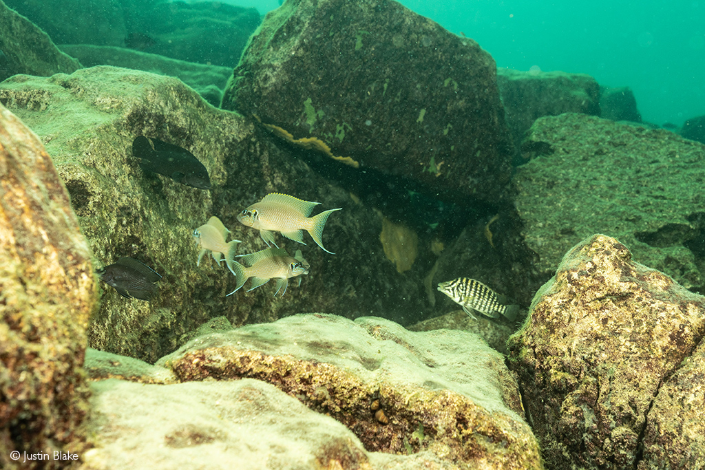 Changing water levels over the millennia and a patchwork of habitats have led to an explosion of evolution among the lake’s cichlids, with around 250 unique and individual species. The cichlids of Tanganyika are remarkable in their diversity, complexity of behaviour, colour and breeding habits, and all but two species in the lake are endemic.