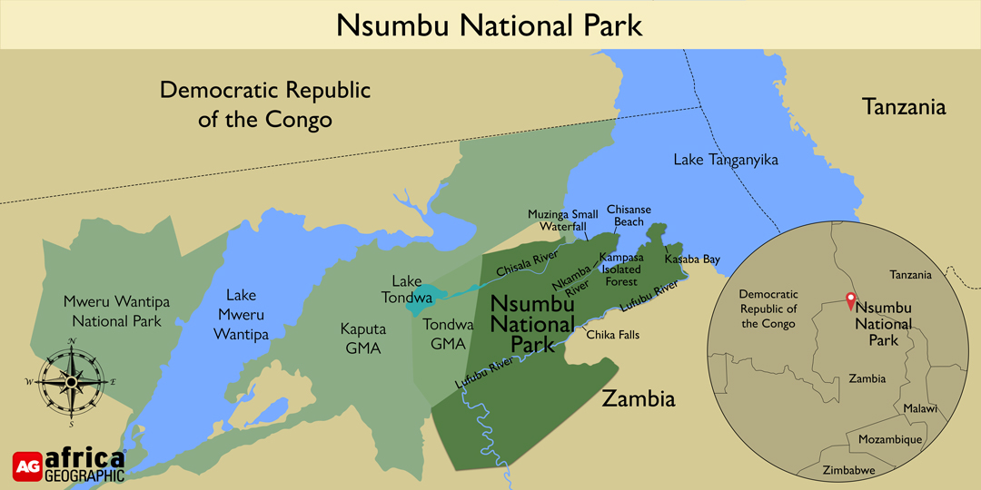Nsumbu National Park covers 2,026km², including over 100km² of protected lake waters and approximately 100km of lake shore. Natural bays, rocky coves, vertical cliffs, and sandy beaches line the park’s long shoreline, while inland, rugged hills, deep valleys, and grasslands are cut through by the Lufubu River, which, flanked by escarpments on either side, marks Nsumbu’s eastern boundary and feeds a variety of streams and wetlands.