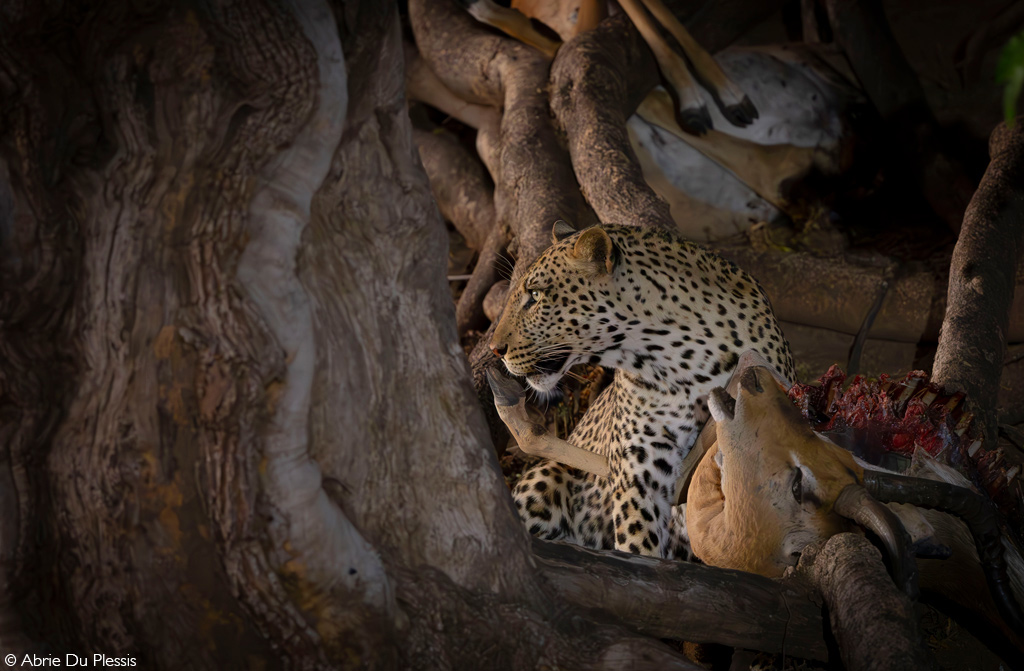 As the sun set, a young male leopard moved through the dry riverbed. He hunted quietly and successfully, catching and hiding impalas amidst the roots of a giant mashatu tree. Nearby, the growls of another leopard could be heard, keeping this leopard highly alert. By evening, he had caught and stashed four impalas (three of which can be seen in this photo). Mashatu Game Reserve, Botswana . © Abrie Du Plessis