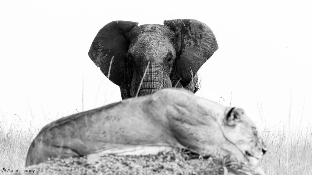 In a curious reversal of roles, a bull elephant looms behind a sleeping lioness, conjuring an almost theatrical image of predator stalked by herbivore. The elephant creeps with intent, before veering away, leaving the lioness to her sun-drenched obliviousness. Maasai Mara National Reserve, Kenya . © Aidan Tinney
