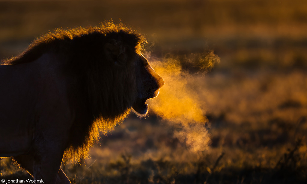 Breath visible in the dawn chill, a lion strides across dew-drenched grass. Maasai Mara National Reserve, Kenya . © Jonathan Wosinski