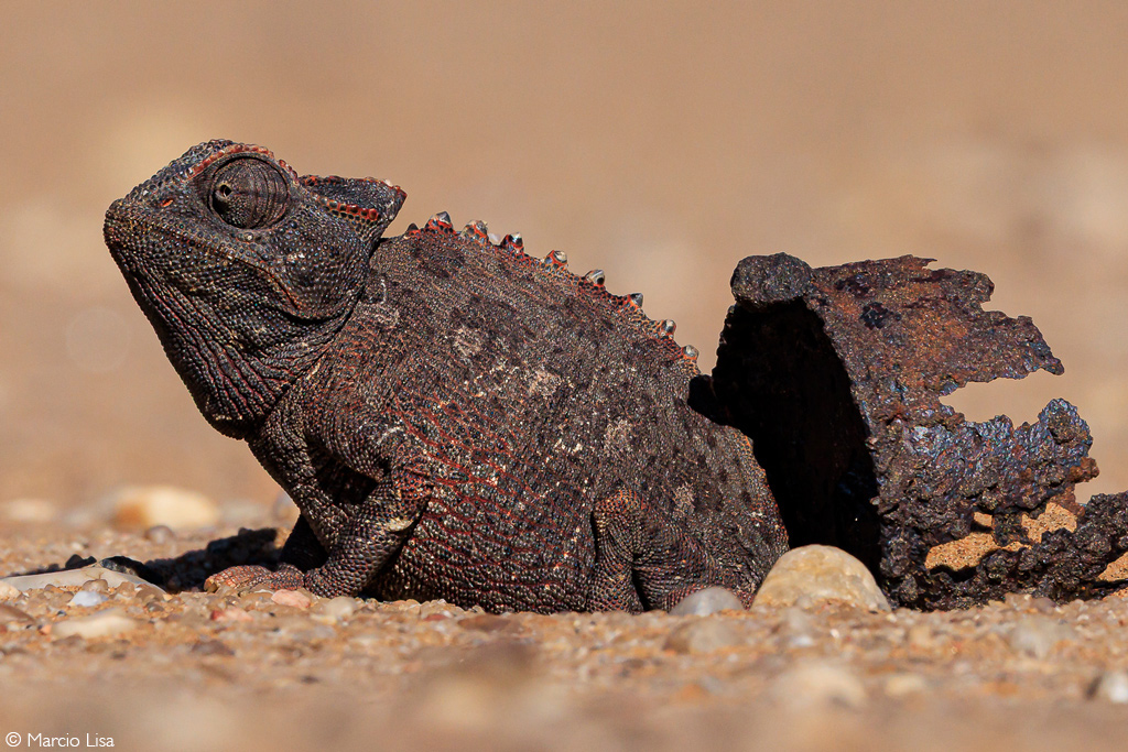 Half reptile, half illusionist. The Namaqua chameleon pauses beside a rusted relic of desert life, its skin mirroring the metal’s mottled hues. Namibia . © Marcio Lisa