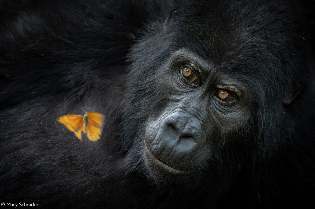 A mountain gorilla lies in quiet contemplation as an orange butterfly flutters onto its fur – a fleeting moment of connection. Bwindi Impenetrable National Park, Uganda . © Mary Schrader