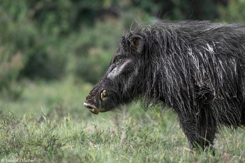 A giant forest hog emerges from the evening rain, a rare glimpse into the secretive world of the Aberdare mountain range. Aberdare National Park, Kenya . © Nicolas Urlacher