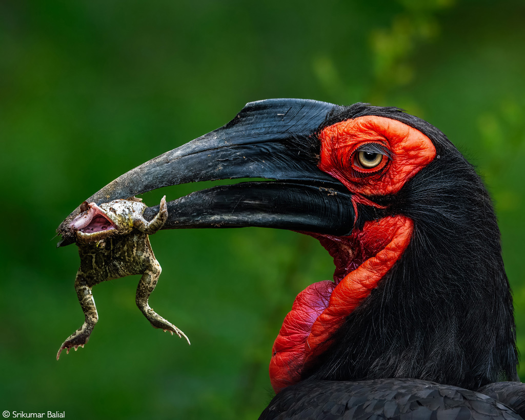 A southern ground-hornbill grasps its catch in its sharp bill – one final wriggle from the African bullfrog before being swallowed whole. Kruger National Park, South Africa . © Srikumar Balial
