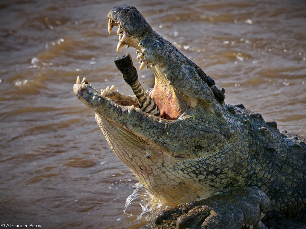 As the herds of wildebeest and zebra have almost completed their crossing of the Mara River, a giant crocodile scoffs down the last bite of one of his victims. Maasai Mara National Reserve, Kenya. © Alexander Perov