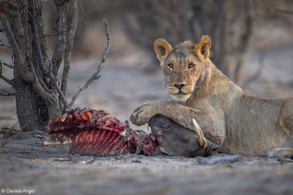 The end of the dry season brings the thirsty – and the hunters – to the waterhole. Here, a young lion claims a large warthog meal, not far from the water’s edge. Hwange National Park, Zimbabwe. © Daniela Anger