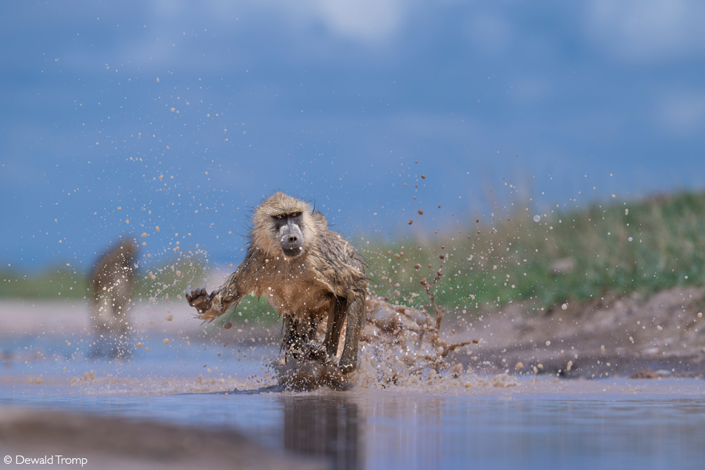 After a thunderstorm, yellow baboons splash and tumble through newly formed pools – childlike exuberance in the shadows of Mt Kilimanjaro. Amboseli National Park, Kenya. © Dewald Tromp