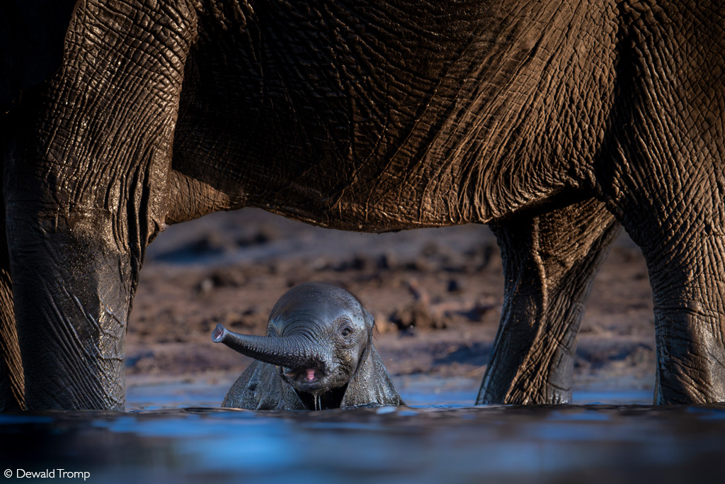 With the summer temperature soaring, cooling off is essential. But in the croc-infested Chobe River, danger always lurks. Staying close to mom is essential for survival. Chobe River, Botswana. © Dewald Tromp