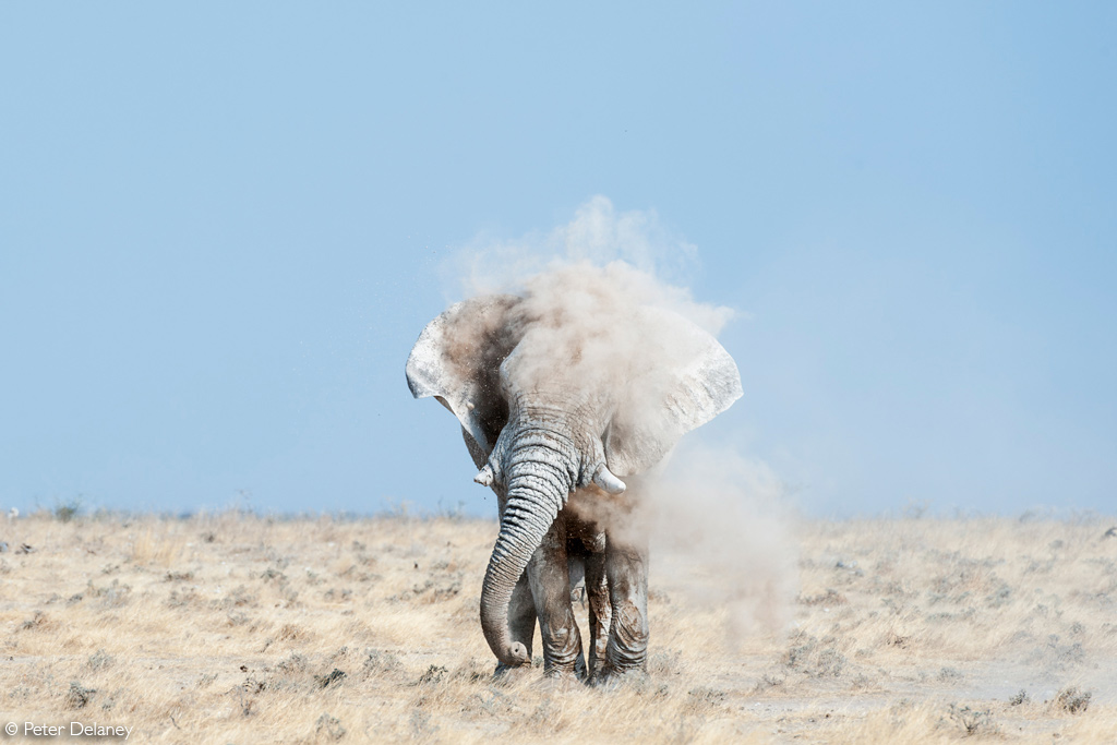 An Etosha elephant bathes in grey dust. Etosha National Park, Namibia. © Peter Delaney