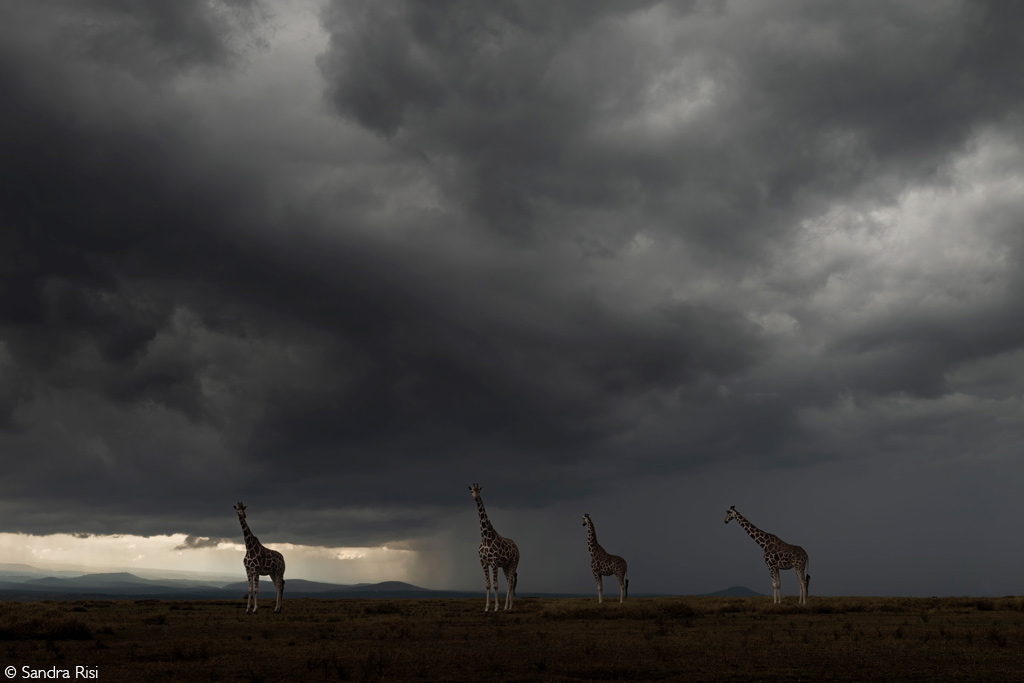 As a thunderstorm gathers, giraffes pause like quarter-note rests on a stave, silent, waiting for the rains to break. Solio Game Reserve, Kenya. © Sandra Risi