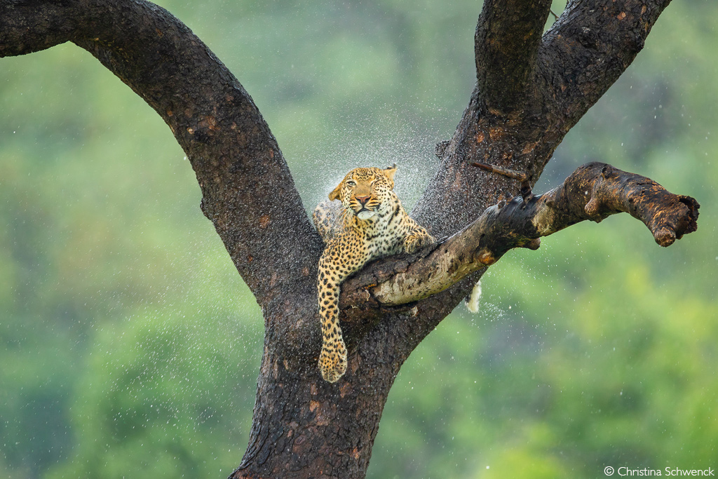 Christina says: “We spotted the leopard sleeping in a tree and decided to wait. After a long period of suspense, with my finger on the camera’s shutter release, the leopard suddenly lifted its head and shook the water from its wet fur. Within seconds, the still life turned into an explosion of water droplets, in the middle of which the alert eye of the big cat seemed to be looking directly into my camera aperture. The picture was taken on one of my first safaris, which sparked my passion for wildlife photography. I only realised later what a rare moment I was able to capture with this photo. Even today, after numerous wonderful photo trips to various African countries, this moment is still one of my photography highlights. My thanks go to my fantastic guides, Bernhard and Hennie.”