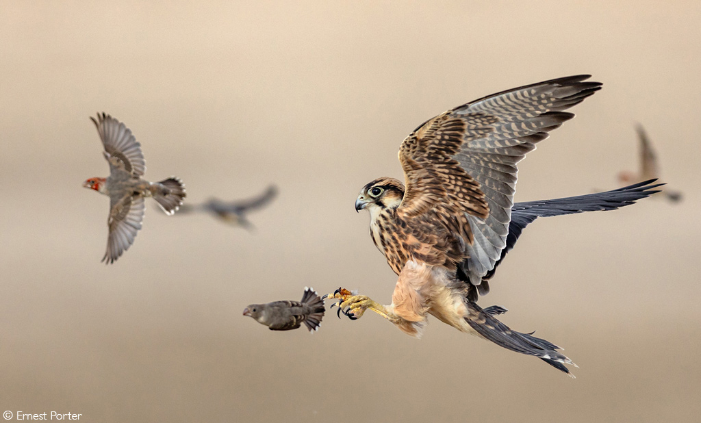 Using a Canon R6MK II and a Canon EF 400mm f2.8 MK II lens, I opted for a high-risk, high-reward strategy. By setting the aperture to f2.8, I leveraged the full-frame sensor to achieve an exceptionally shallow depth of field, creating that striking background blur that isolates the subjects. While many would have played it safe with a larger aperture, this choice was crucial to the success of the photograph. What truly makes this photo for me is the raw intensity in the lanner falcon’s expression as the red-headed finch, by a mere whisker, dodges a bitter fate and escapes the falcon’s deadly talons.”