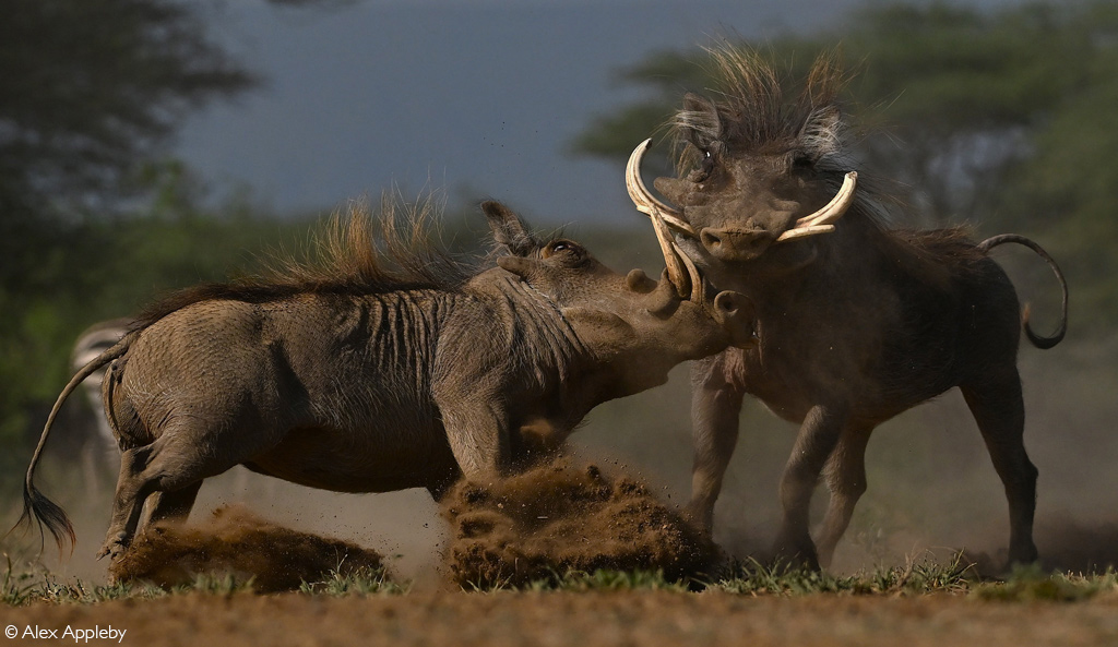Alex says: “These warthogs were very large and very powerful – and fighting for prime territory around a waterhole in the dry season. The fight went on and on, neither combatant wanting to give in, and, as they seemed well matched, it was as much a battle of wills as of strength. Neither wanted to concede. They drifted further and further away until, finally, one gave up and ran off, still pursued by the victor. I think I was as exhausted, due to the excitement of the spectacle, as they were.”