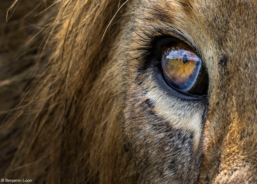 A sublime study in focus and restraint. The detail in the lion’s eye – its glassy reflection, the mirrored sky, the curve of lashes – is mesmerising. The shallow focus isolates that unforgettable gaze, and the golden fur is rendered with exquisite sharpness – every strand visible and warmly lit. Exceptional control of light and composition. The lion’s iris, captured in such crisp detail, resembles a celestial sphere – a planetary disc orbiting a pupil, with soft cloud forms and light reflections creating an almost cosmic depth. A closer look reveals a tick, and a fly, beneath the eye, tiny intrusions into this otherwise serene moment, reminding us of the reality of life in the bushveld.