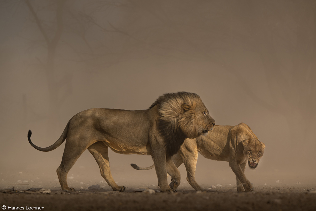 A perfect storm of mood and movement. Hannes’ signature skill in using desert dust as atmosphere is evident here – the hazy silhouettes of thorn trees, the grainy sky, and the faint ghost of heat. The composition leans into narrative – the male’s surprise, the female’s defiance, both isolated by the natural vignette of swirling sand.