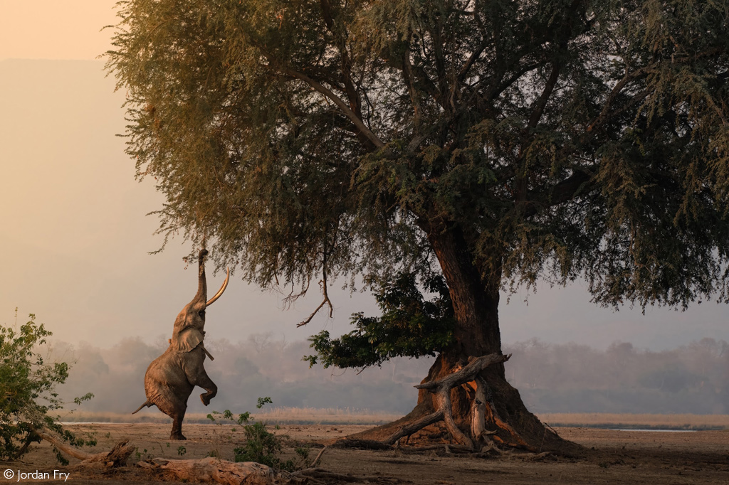 An iconic subject captured with refined perspective. Jordan’s use of vertical space and compositional scale showcases Boswell’s acrobatics while emphasising the immense sweep of the Zambezi Valley. The soft golden light, and placement of Boswell’s frame dwarfed beneath the mashatu tree, root this scene in dry-season elegance. A timeless portrait of a legend. This is not just a photograph of a well-known elephant. It is a celebration of behavioural wonder, of ecological context, and of the delicate balance between strength and poise.