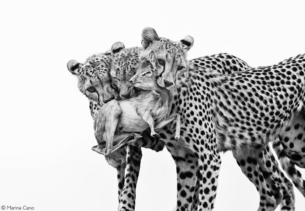 Marina says: “Three young cheetah brothers, caught in a moment of instinct and learning, hold a dik-dik in their jaws. Despite the tension, there’s poetry in the prey’s face, a quiet contrast to the intensity of the hunters.”