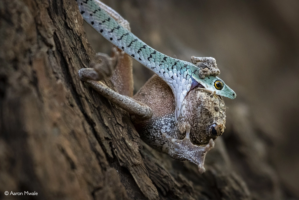 At one of South Luangwa’s famed wild mango trees, a spotted bush snake hunts a tree frog. Sometimes, Luangwa’s drama unfolds in miniature. South Luangwa National Park, Zambia. © Aaron Mwale