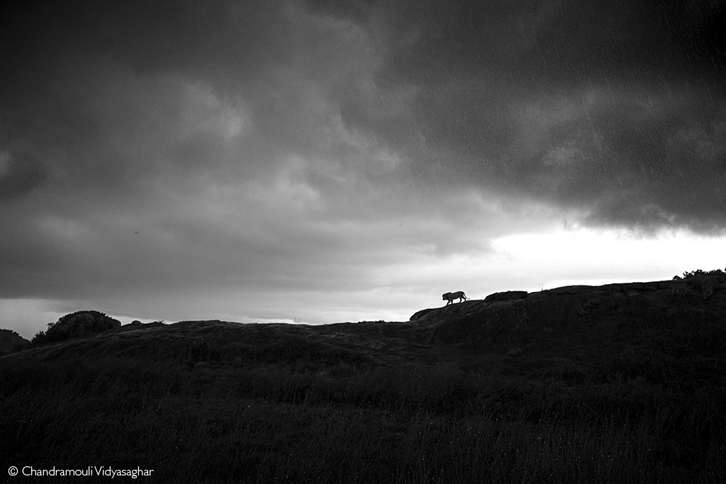 As storm clouds gather over the Central Serengeti, the lion known as Scarnose patrols his kopje – a dominant male holding contested ground beneath a brooding sky. Serengeti National Park, Tanzania. © Chandramouli Vidyasaghar