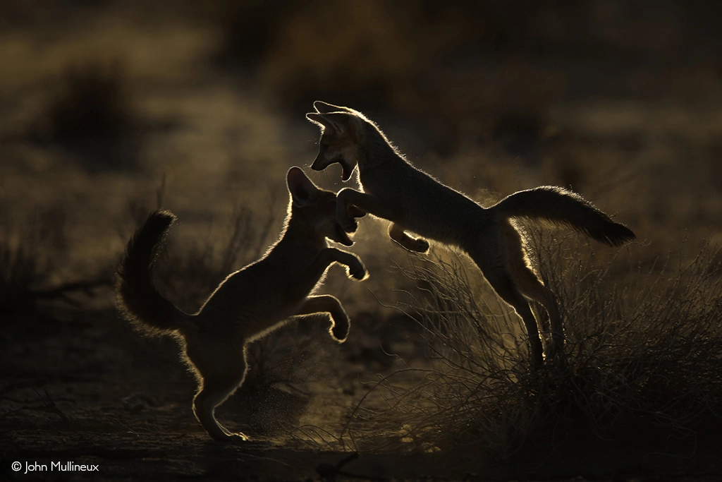 In early backlight, young Cape foxes tumble and explore before retreating from the rising Kalahari heat. Kgalagadi Transfrontier Park, South Africa. © John Mullineux