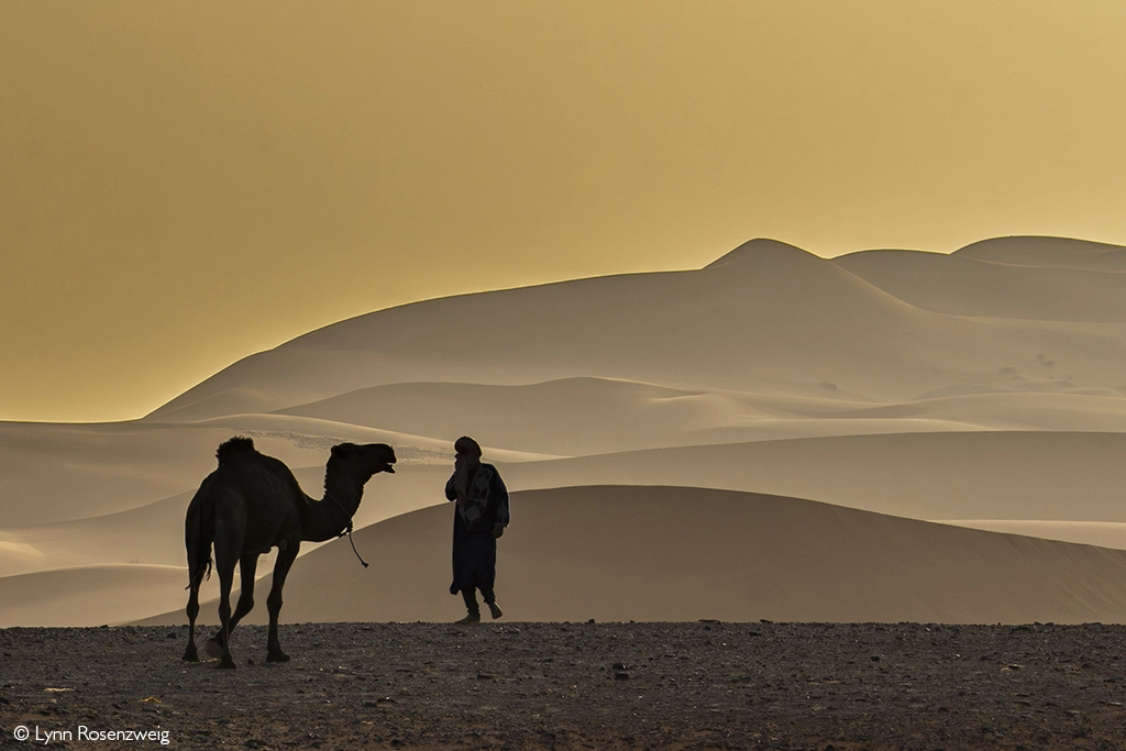At sunrise in the Sahara, a camel herder and his charge pause mid-journey, dwarfed by dunes sculpted in gold. Sahara Desert, Morocco. © Lynn Rosenzweig