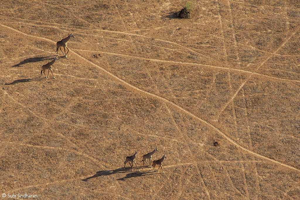 Masai giraffes cross Shompole’s patterned Earth, their long shadows sketching parallel lines across the ground. Shompole Conservancy, Kenya. © Subi Sridharan