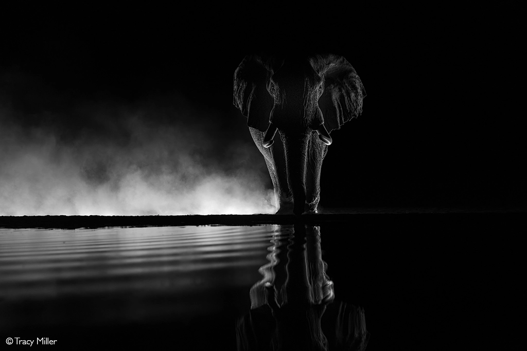In the hush of night, an elephant materialises from dust at a Shompole waterhole – presence announced by breath alone. Shompole Conservancy, Kenya. © Tracy Miller