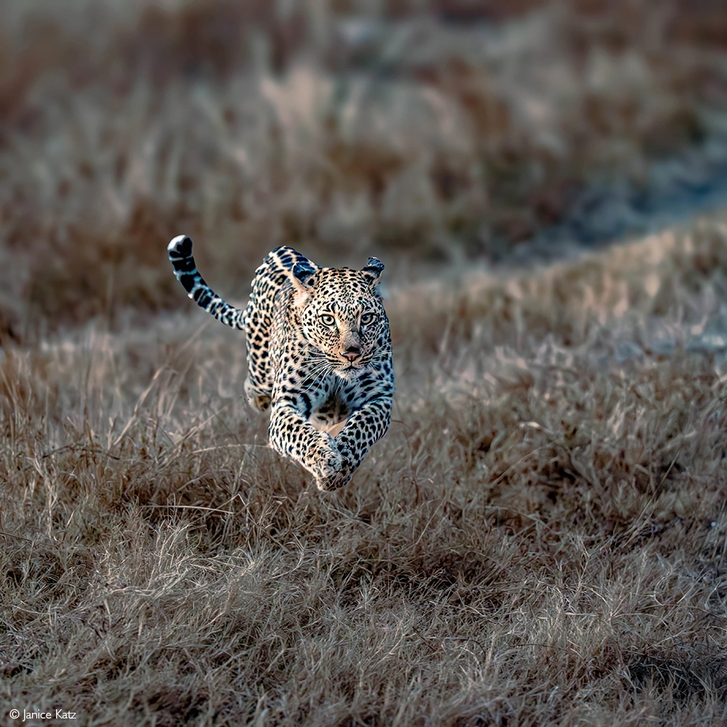Leaping leopard. A leopard launches for safety, heading for the nearest tree, as a pair of lions give chase – a split-second leap that saves her skin. Sabi Sands Game Reserve, Greater Kruger, South Africa. © Janice Katz