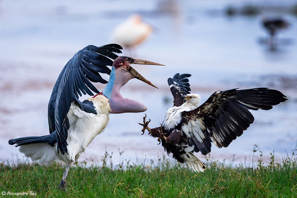 On Lake Nakuru’s alkaline shores, an African fish eagle and a marabou stork dispute a freshly caught fish, locked in a moment of wetland rivalry. Lake Nakuru, Kenya . © Alexandre Bes