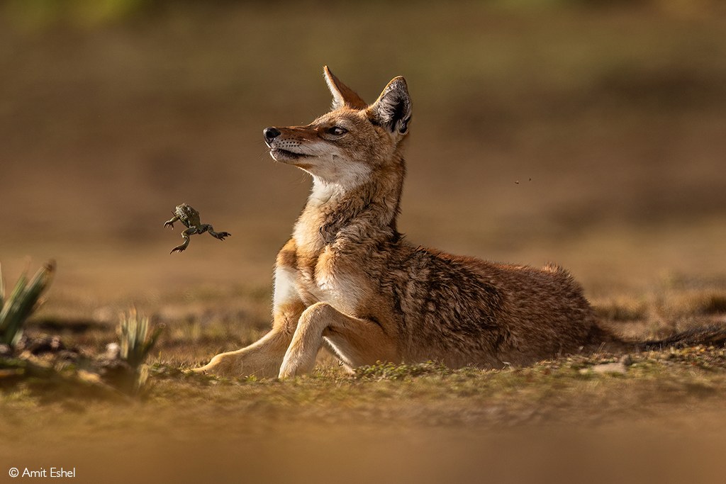 An Ethiopian wolf pup plays with a burrowing tree frog, tossing it into the air – youthful practice for a hunter still learning the skills of survival. Bale Mountains National Park, Ethiopia. © Amit Eshel