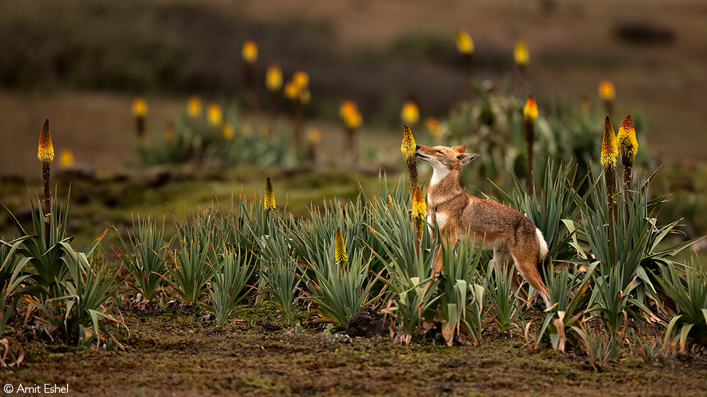 An Ethiopian wolf feeds on the nectar of red-hot poker flowers – a remarkable behaviour only recently documented, making them the world’s first known pollinating carnivores. Bale Mountains National Park, Ethiopia. © Amit Eshel