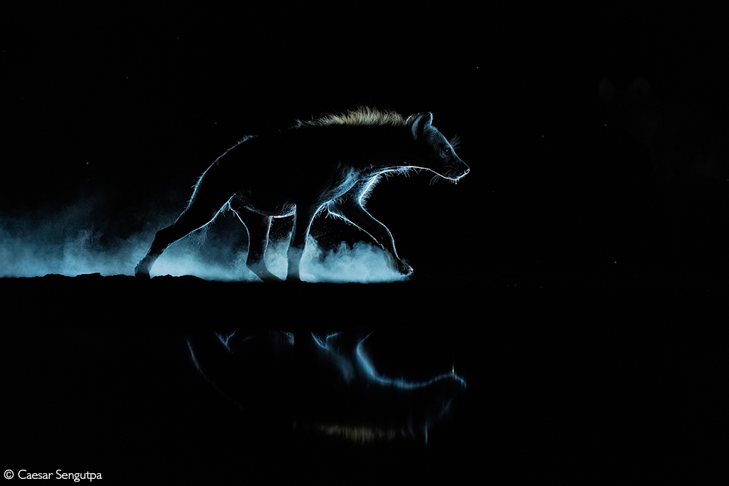 A spotted hyena materialises from dust and darkness, its raised mane catching the backlight at the waterhole, a faint apparition of reflection below. Laikipia , Kenya. © Caeser Senguta