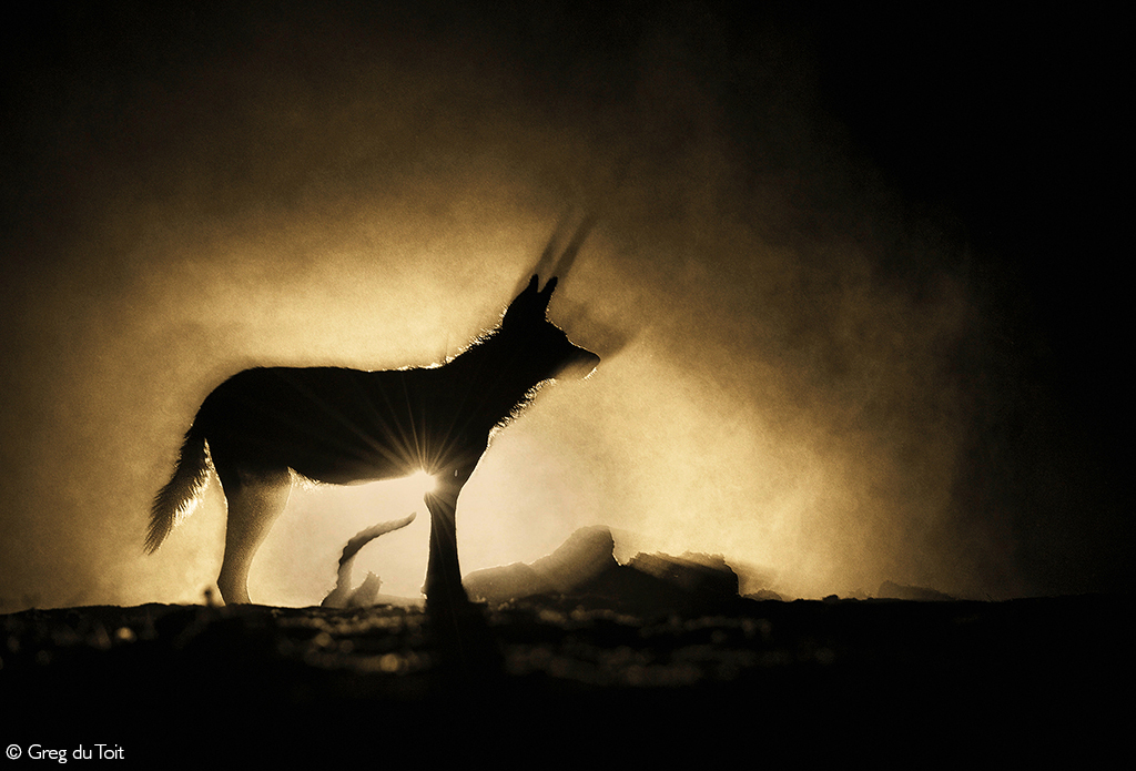 At dusk in Mana Pools, a wild dog feeds on a freshly caught impala, dust hanging thick in the air as the fading sun highlights its silhouette and shadow. Mana Pools National Park , Zimbabwe. © Greg du Toit