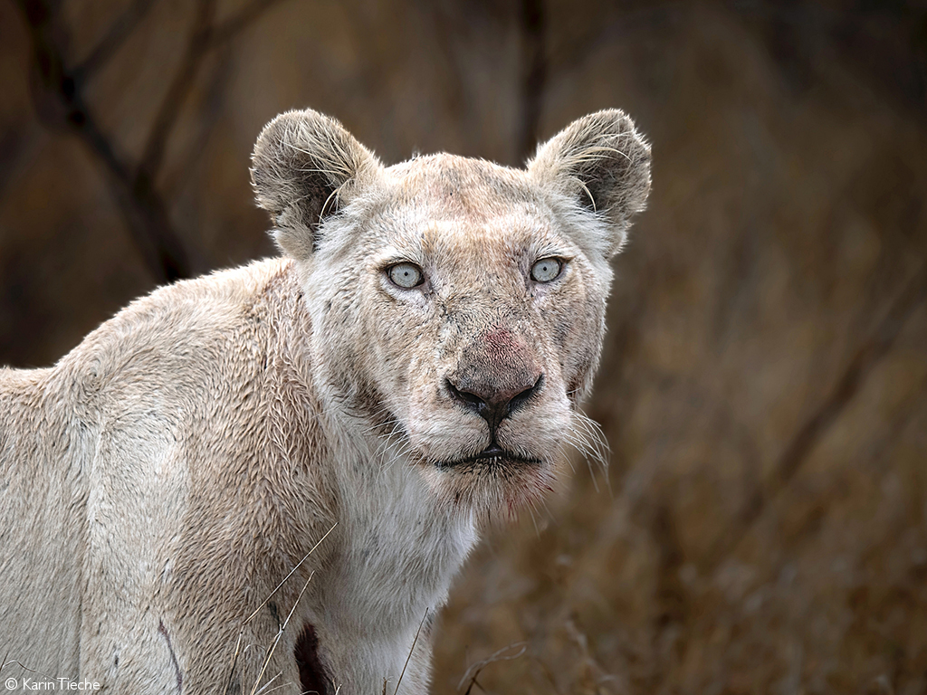 The rare white lioness of the Birmingham Pride – pale, powerful, and unforgettable to encounter on the plains of Kruger. Kruger National Park , South Africa. © Karin Tieche