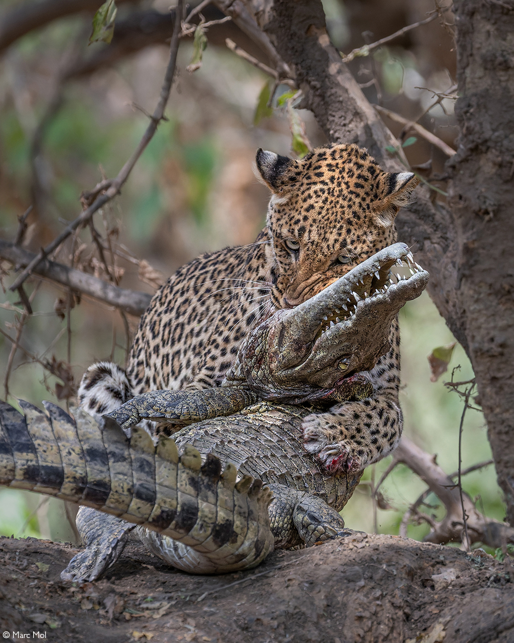 A 14-year-old leopardess grapples with a crocodile she ambushed on the Zambezi River’s edge – a rare choice for a leopard but one sure to leave her satiated for days. Lower Zambezi National Park , Zambia. © Marc Mol