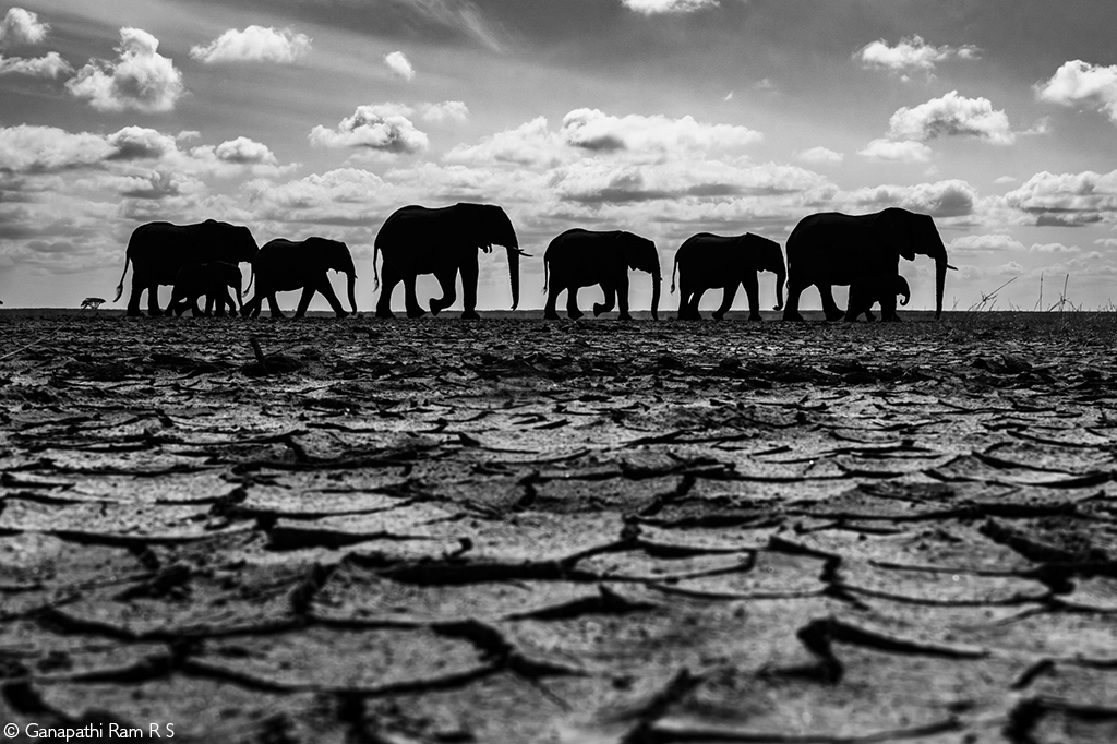 March of survival. A herd of elephants crosses Amboseli’s dry lakebed, making for the distant marshes where water can still be found. Amboseli National Park, Kenya. © Ganapathi Ram R S