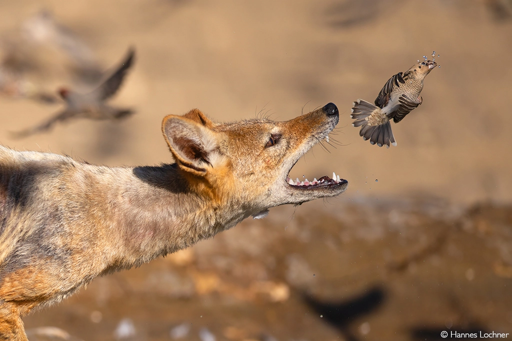 The Getaway. At a Kalahari waterhole, a black-backed jackal lunges for a red-headed finch – but today, the finch is quicker. Central Kalahari Game Reserve, Botswana. © Hannes Lochner