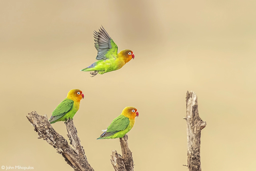 Melody of colours. For a few fleeting seconds, Lilian’s lovebirds gather on dead branches before vanishing again – a brief burst of colour in the early Serengeti light. Serengeti National Park, Tanzania. © John Mihopulos