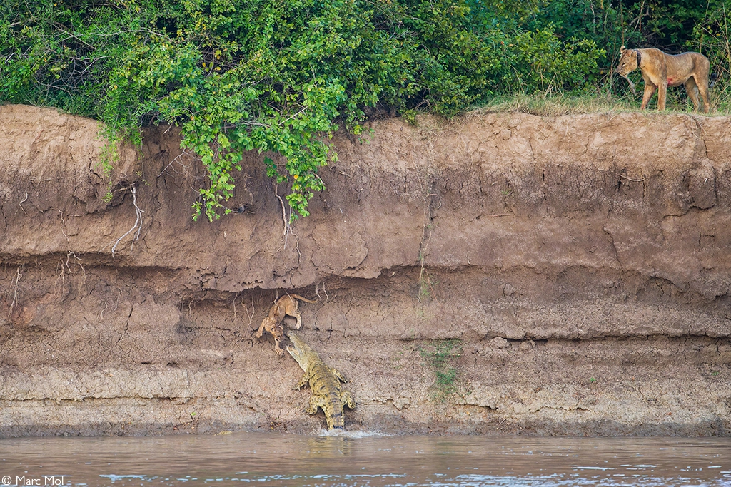 A mother lion of the Nsefu Pride watches helplessly from above as a large crocodile targets – and succeeds in taking – her cub below. A tragic chapter in the pride’s ordeal on the Luangwa’s steep banks. South Luangwa National Park, Zambia. © Marc Mol