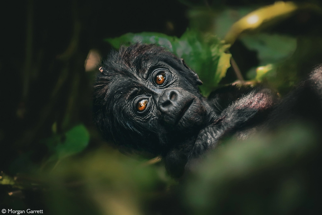 Half-hidden in the thick forest undergrowth, a young gorilla looks out with wide, reflective eyes – a quiet moment of curiosity in Bwindi’s green tangle. Bwindi Impenetrable National Park, Uganda. © Morgan Garrett